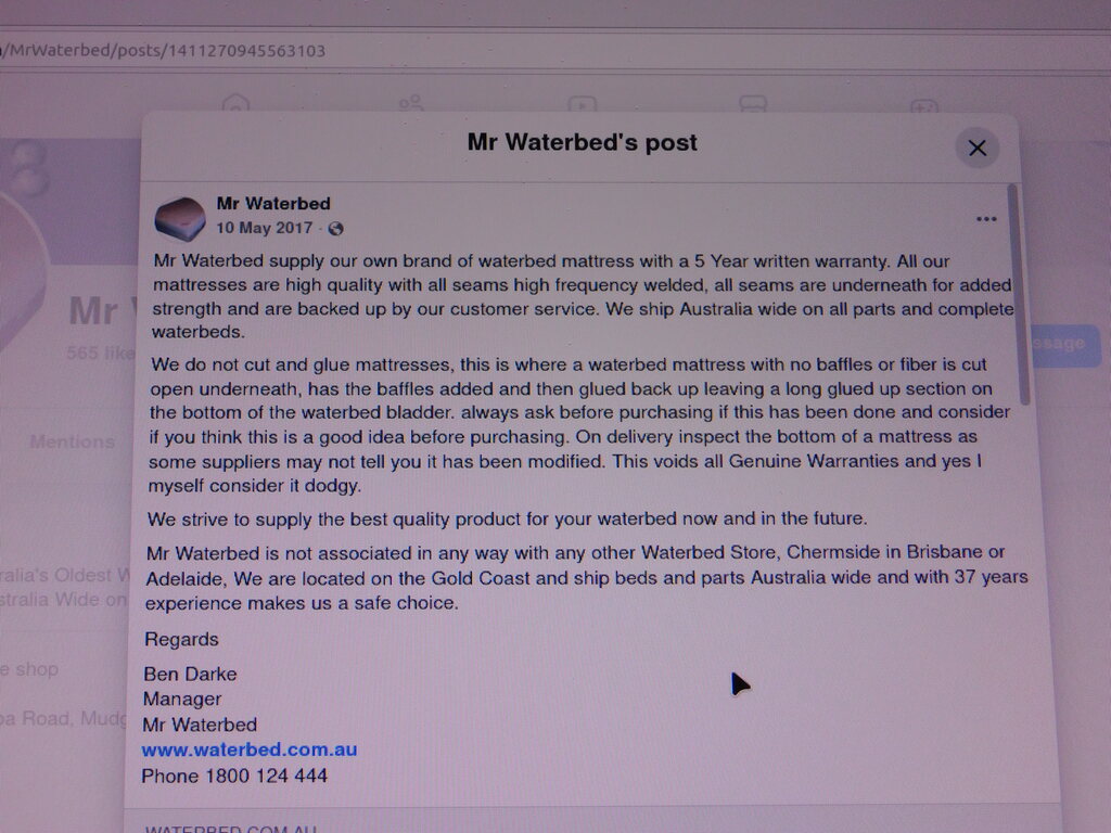 ( Readily believed by targeted audiences, persuasive claims to be the best need to be challenged by ringing around. The overwhelming claims by some undermines trust in the true blue professional waterbed companies. Selective partial information that amount to " ALL OUT LIES " by deception hurt the true quiet achievers in the waterbed industry around Australia, who truly believe in the quality of waterbeds. By visiting a showrooms in Melbourne, Adelaide and Brisbane for example there is a lot more to offer. There is one who knocks aggressively on their website. But behind the scene the true waterbed professionals work together as a team across Australia )